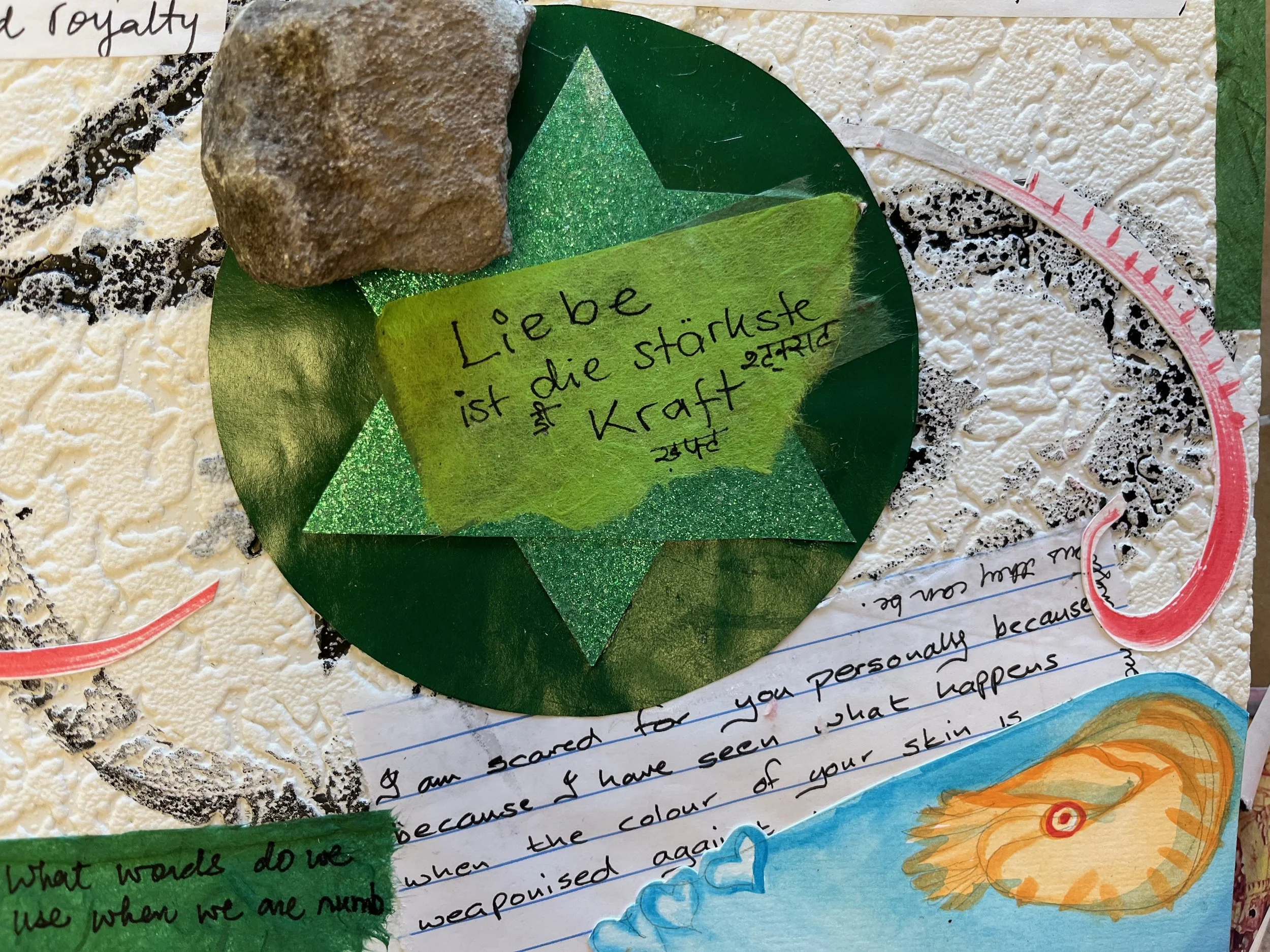 As the others in class heard about my project they reached out with worries and care. A German woman who sat across from me said she was born 10 years after the end of WW2. She knew about resistance. She covered her eyes saying she didn’t want to see it happen again, in my country. Another woman was South African. She said she worried for me because she had seen how people can weaponize the color of your skin and use it against you. I asked her to write it down for me to include in the book. A British man who was also a classmate told me many stories of cobblestones and we discussed how people tell stories of trauma to the next generation and when they don’t. We discussed how I had seen the names of people who were murdered and also seen so many nameless people who were still alive. I asked him for words. He have me questions like Who lives and who is forgotten? Who passed by here? I asked the German woman to write me something in German to take back with me. She translated it to be: Love is the strongest power. (I wrote the German words in the phonetic Devanagari script so I could pronounce them correctly.)