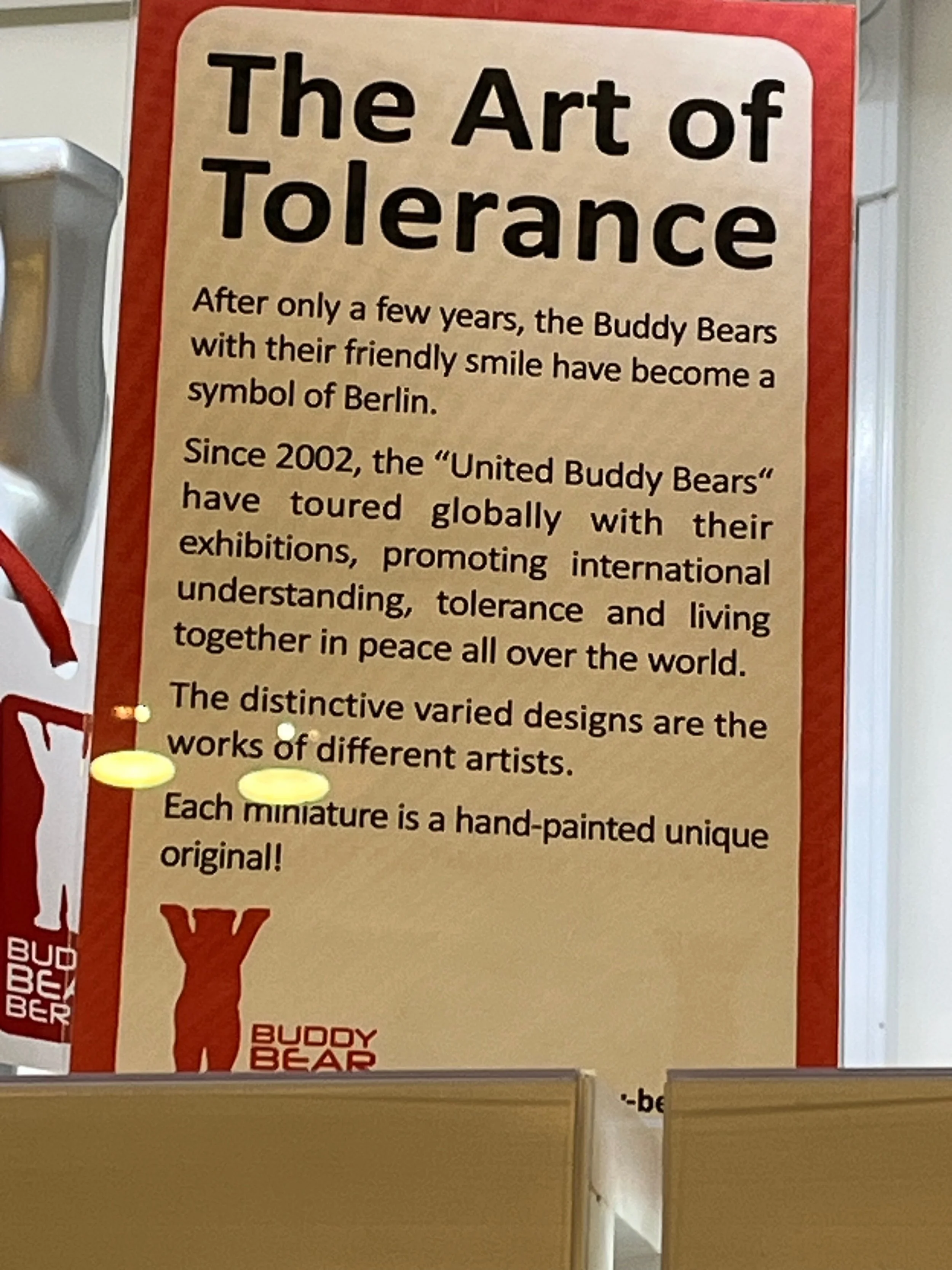 At an airport souvenir shop I learned more about the Buddy Bear project and The Art of Tolerance. There had been a Buddy Bear at my hotel’s reception! August 2025, Berlin.
